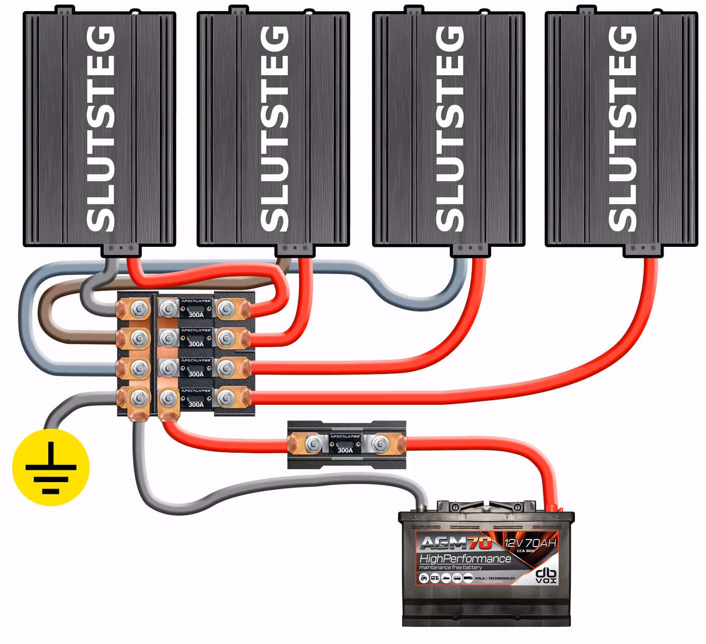 dBVox strömkit är ett komplett paket som innehåller allt som behövs för följande installation 4st slutsteg som har dubbla batteri upp till 2000W rms