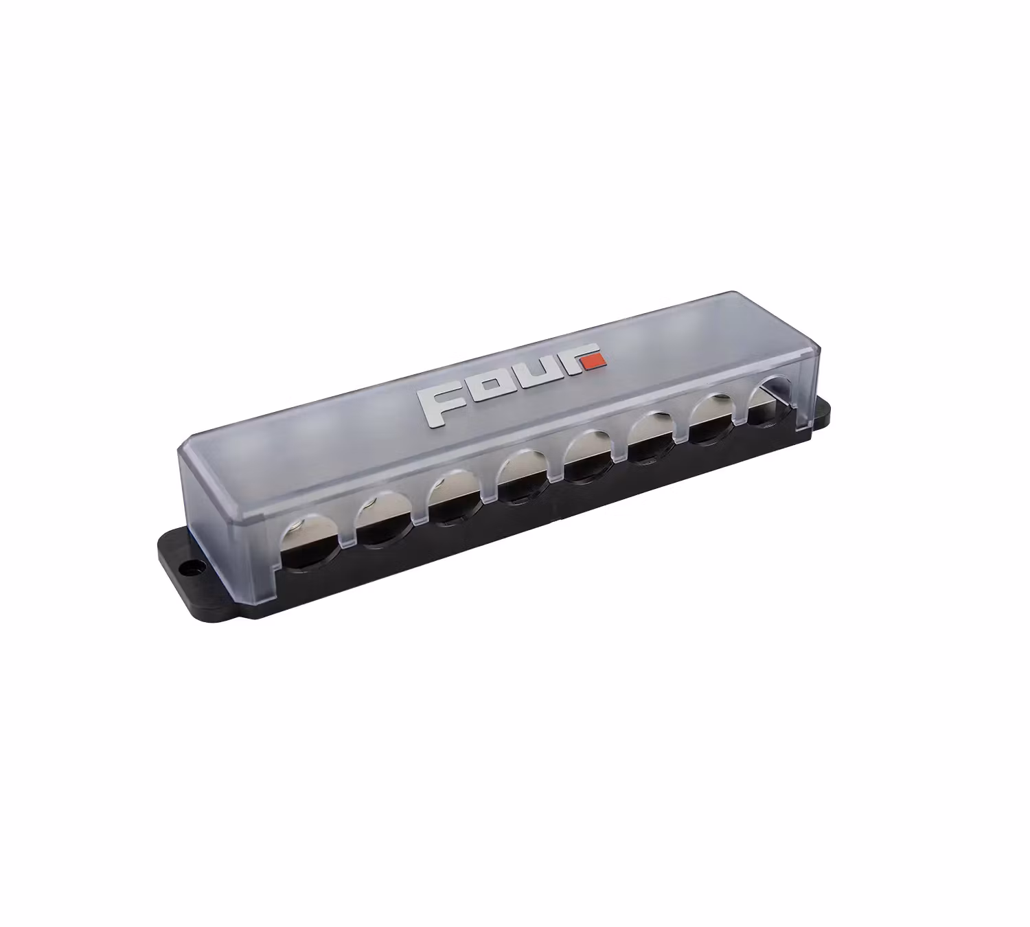 Rälsen har 8 st 8 mm bultar där du kan fästa ringkontakterna. Kablarna kan förs in i stången från båda sidor (även mot varandra samtidigt) tack vare den öppna strukturen på locket. Genom hålen i ändarna kan rälsen säkert fästas på plats.