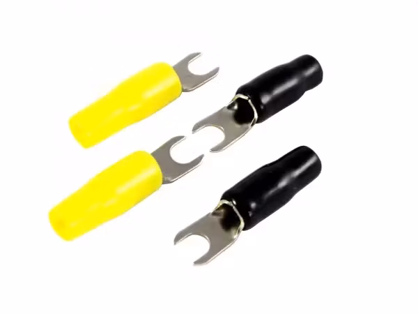 Två par gaffelkabelskor som passar kablar upp till 9,6 mm i diameter. Ena paret är svarta och det andra är gula för enkel identifiering (4st/förpackning).