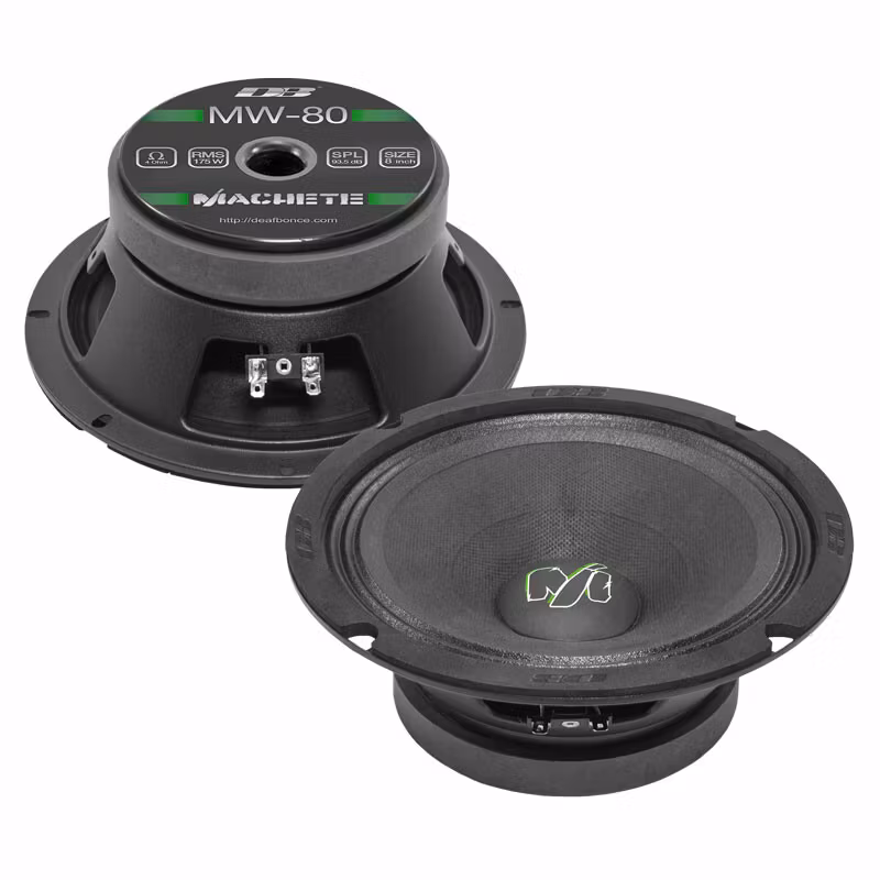 4st Deaf Bonce Machete MW-80 8" midbasar. Kraftig midbas som går ner till 60Hz och gör att man får ett mycket fylligare ljud från högtalarsystemet. Perfekt för den som vill ha med tryck i djupet i midbasen. 2" talspole så ger den hela 175W rms eller 350W musik.