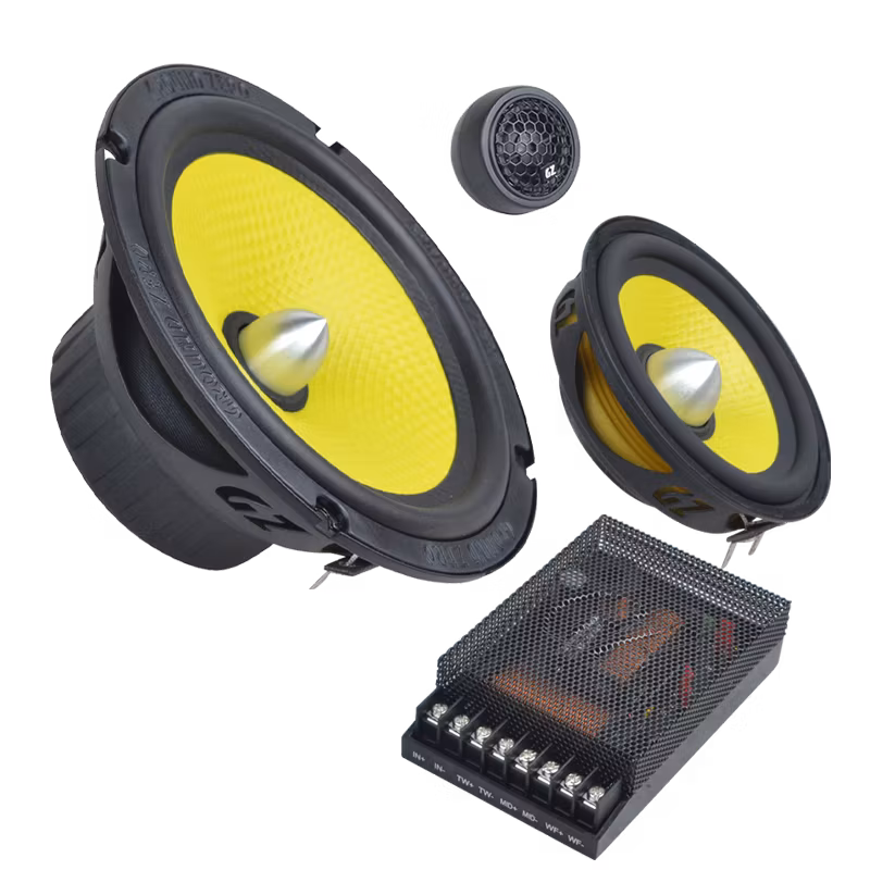 12 dB/oct. crossover (mid/high) / 6 dB/oct. crossover (kickwoofer) / Haxagon protection grill.