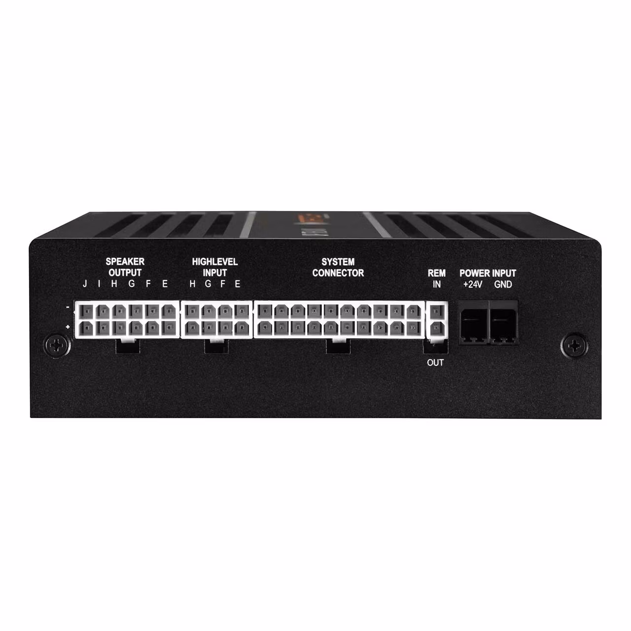 Compatibility: Only for operation on 24 Volts vehicle electrical systems! Technical data: UP 10DSP – 24V Edition Output power RMS - @ 4 Ohms Channels A - H: 8 x 65 Watts - @ 2 Ohms - - @ 1 Ohm - - bridged @ 4 Ohms - - bridged @ 2 Ohms - - Subwoofer output @ 4 Ohms Channels I - J: 2 x 90 Watts - Subwoofer output @ 2 Ohms Channels I - J: 2 x 160 Watts Amplifier technology Class GD Inputs 8 x Highlevel speaker input 1 x Optical SPDIF (12 - 96 kHz) 1 x Remote In Input sensitivity Channels A - F: 4 - 16 Volts Channels G - H: 4 - 16 or 8 - 32 Volts Input impedance RCA / Cinch - Input impedance highlevel 9 - 33 Ohms with ADEP.3 Outputs 10 x Speaker output 1 x RCA / Cinch 1 x Remote Out Output voltage RCA / Cinch 3 Volts Frequency response 10 Hz - 22,000 Hz DSP resolution 64 Bit DSP power 295 MHz (1.2 billion MAC operations/second) Sampling rate 48 kHz DSP type Audio signal processor Signal converters A/D: BurrBrown D/A: BurrBrown Signal-to-noise ratio digital input 105 dB (A-weighted) Signal-to-noise ratio analog input 103 dB (A-weighted) Distortion (THD) 0.03 % Damping factor 100 Operating voltage 18 - 36 Volts (max. 5 sec. down to 12 Volts) Power rating DC 24 V ⎓ 32 A max. Idle current 210 mA Max. remote output current 500 mA Operating temperature range -40° C to +70° C Fuse 2 x 25 A LP-Mini-fuse (APS) Additional features Class GD technology with dynamically controlled power supply, 32 Bit CoProcessor, ADEP.3 circuit, Start-Stop capability, Smart Control Port, USB, MEC slot, Auto Remote switch, galvanically isolated Line Out Dimensions (H x W x D) 46 x 145 x 163 mm / 1.81 x 5.71 x 6.42″ Scope of delivery: 1 x MATCH UPGRADE amplifier UP 10DSP – 24V Edition 2 x Connection cable 1 x Mounting plates & material 1 x USB cable 1 x Instruction manual