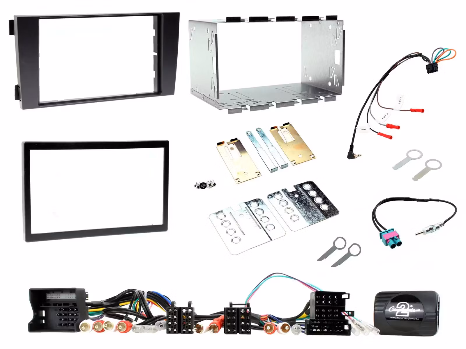 Audi A6 installationssats. Levereras med Double Din monteringsram Kit, CAN - Buss rattkontroll (ISO och Quadlock kontakter), dubbel FAKRA antennadapter, Audi urtagningsnycklar och Universal huvudenhets - koppling.