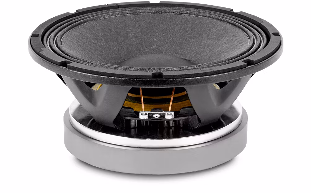 BEYMA 10MCB700 är ett 10-tums lågfrekvenselement med ferritmagnet, konstruerat för att leverera upp till 700 W AES och 1400 W programeffekt. Den har en 3-tums DUO-talspole med inre/yttre lindning, aluminium Faraday-ring och Beymas Maltcross®-kylsystem som minimerar kompressionsförlust. Den väderbeständiga konen är behandlad på båda sidor för ökad hållbarhet. Perfekt för midbass och subwooferapplikationer i portabla och fasta PA-system.