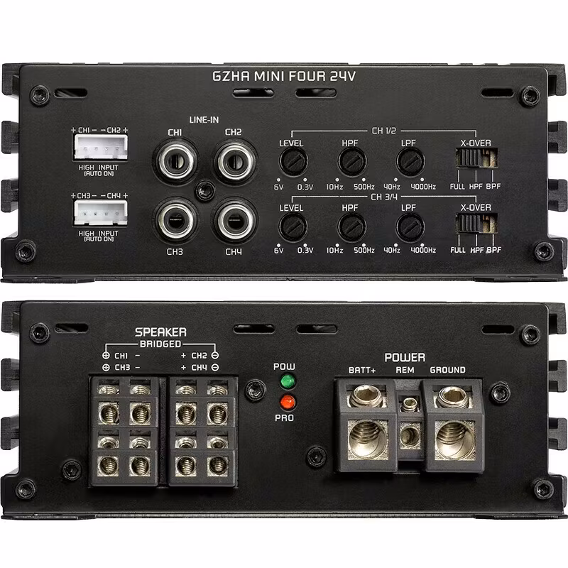 - • High level input - MODELSPEC: Vahvistimet - TECHNICALDATA: - High efficient class D mini amplifier to 24V systems - Extreme compact size - 2 Ohm stable stereo - 4 ohms stable in bridged mode - High-level input with Auto-On - Adjustable wide-range filters - Adjustable input sensitivity - Thermal / short circuit / overload protection Output Power @ 2 Ohm (CEA*) 4 x 130 W Lowpass40 Hz – 4000 Hz Highpass10 Hz – 500 Hz Bandpass10 Hz – 4000 Hz Dimensions: 13,5 x 2,1 x 5,2 cm.